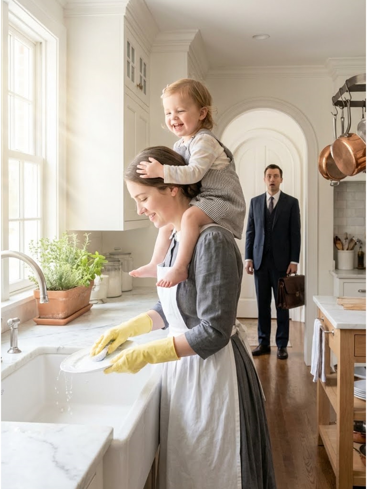 Allí estaba Ava. Su hija silenciosa y sumida en el dolor. Sentada sobre los hombros de la criada, riendo mientras lavaban los platos juntos. No solo sonriendo, sino riendo. Una risa brillante y musical que no había oído desde la noche en que todo se vino abajo.