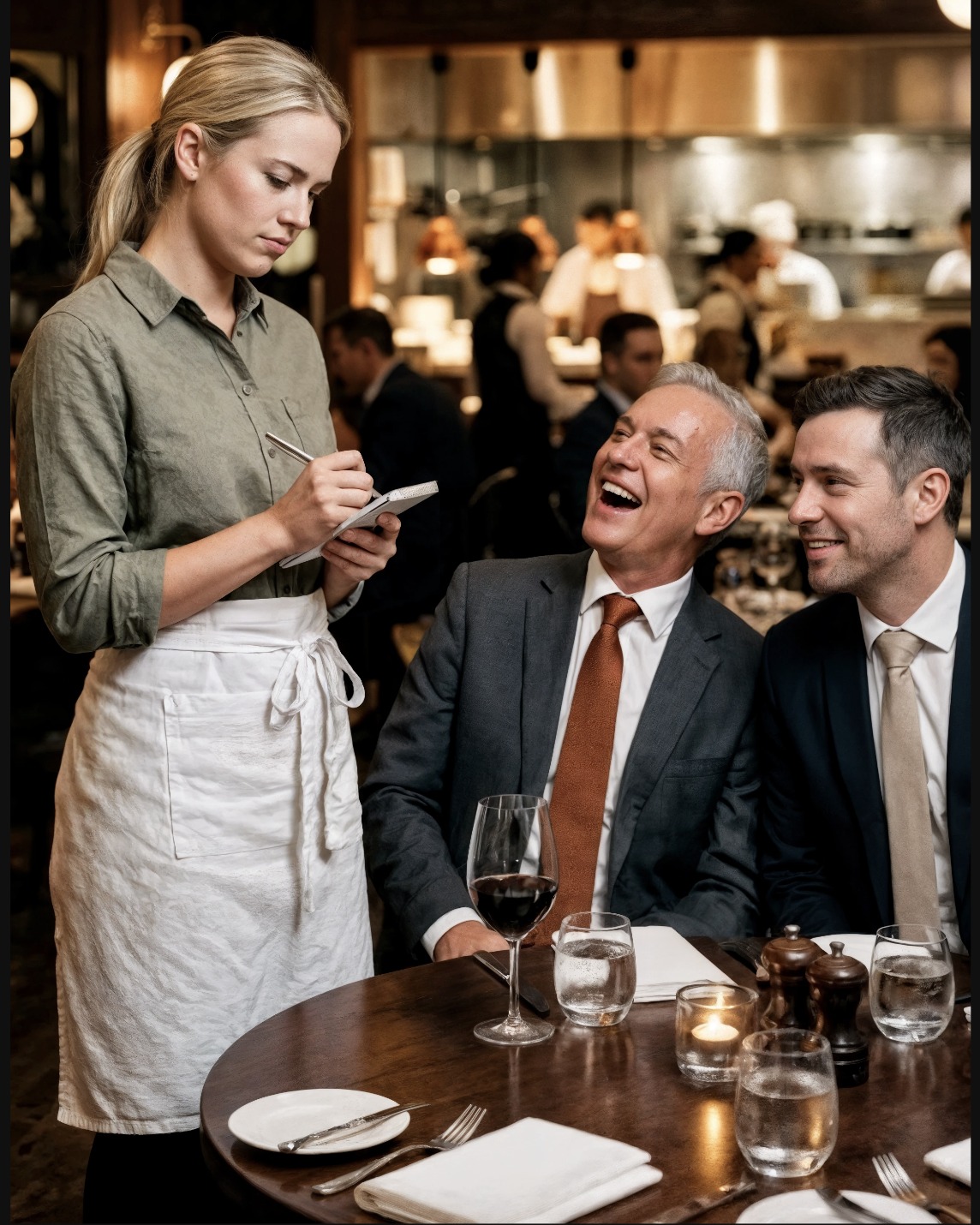 En la mesa doce, un hombre con un traje gris oscuro a medida tamborileaba con los dedos sobre el mantel blanco. Un gran reloj de oro en su muñeca reflejaba la luz de la lámpara. Frente a él estaban sentados dos colegas, riendo más fuerte de lo necesario ante sus comentarios. Harper se acercó con una bandeja de bebidas. "Su agua mineral, señor", dijo en voz baja.