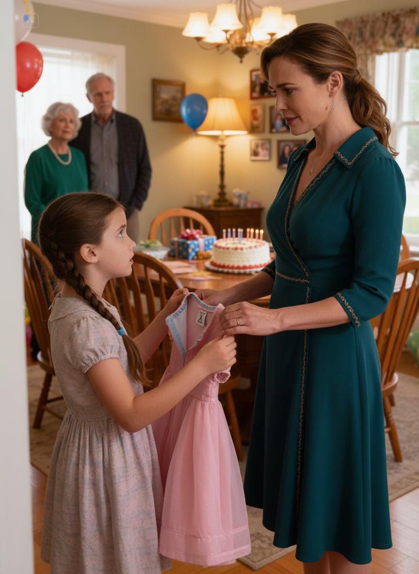 Emma chilló de emoción y sacó el regalo de la bolsa. Un vestido rosa se deslizó fuera: tul suave, lentejuelas diminutas, el tipo de vestido que las niñas imaginan cuando se imaginan siendo princesas. El rostro de Emma se iluminó al instante. Lo abrazó contra su pecho y se dio la vuelta, riendo.