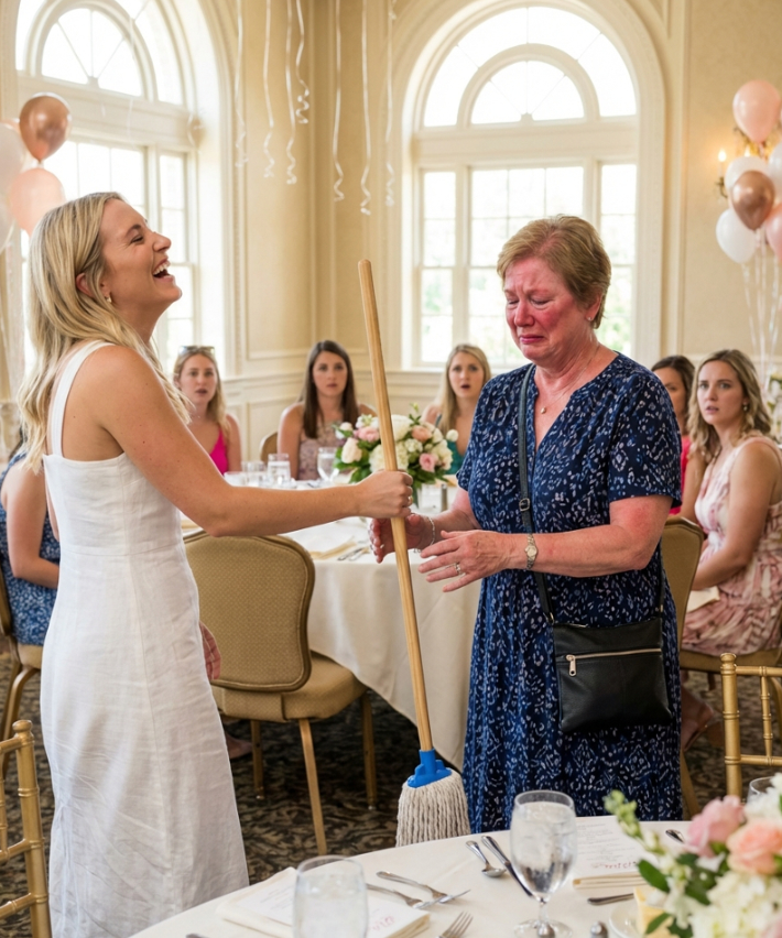 La sala quedó en silencio. Emily no miró a los anfitriones ni al personal de catering. Me miró directamente a mí. Luego, extendió la mano junto a la estación de catering, agarró una fregona que habían colocado allí con una intención escalofriante y me la acercó.