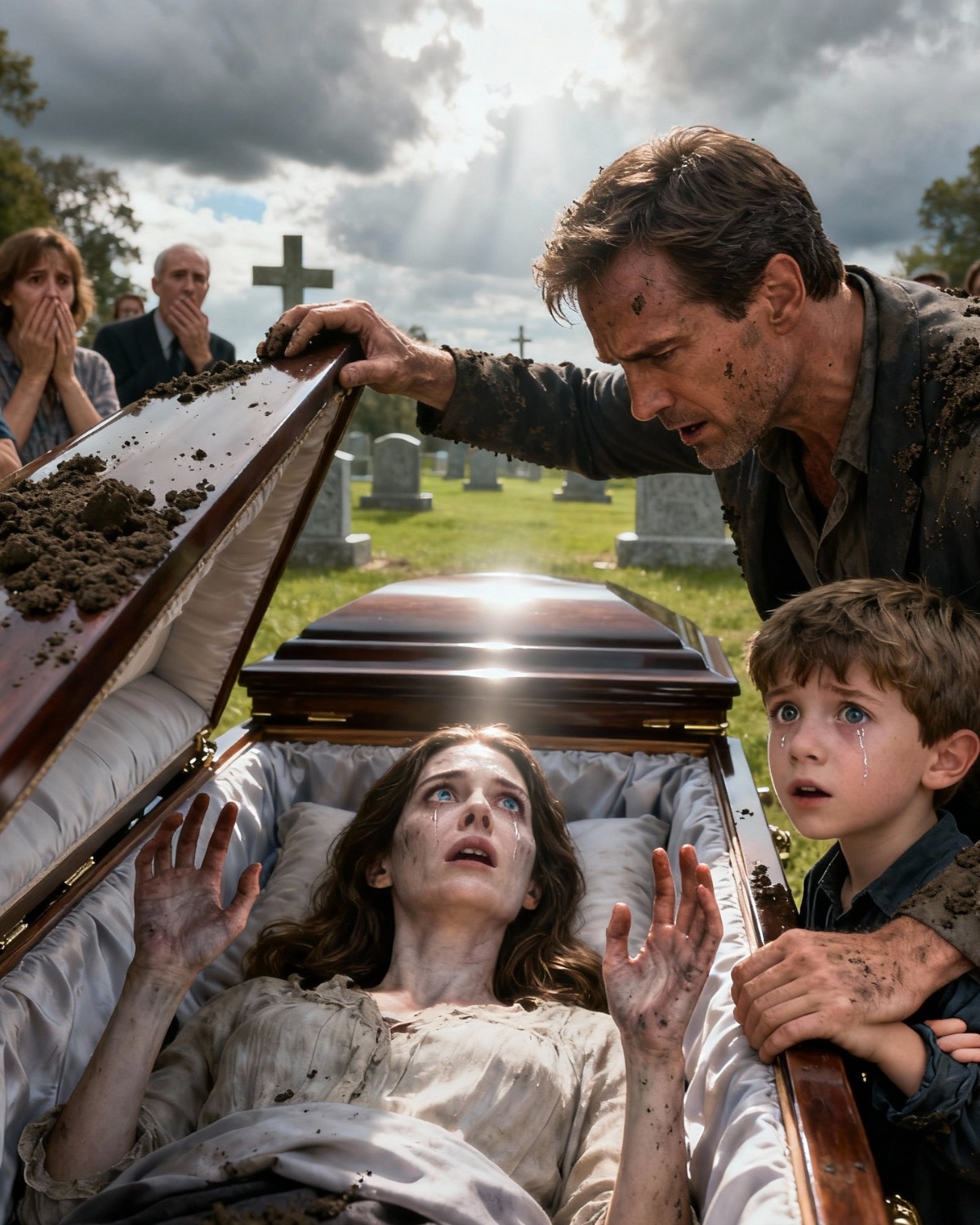 “Hacía apenas una hora que había enterrado a mi esposa cuando mi hijo de 7 años me tiró de la manga, susurrando con voz temblorosa: ‘Papá… mamá me llamó desde dentro del ataúd’. Pensé que estaba abrumado por el dolor, pero el terror en sus ojos hizo que se me encogiera el corazón. Sin saber por qué, me escuché decir: ‘Desentiérrenlo’. Cuando la tapa del ataúd se abrió, todos contuvieron el aliento… porque lo que vimos dentro… lo cambió todo.”