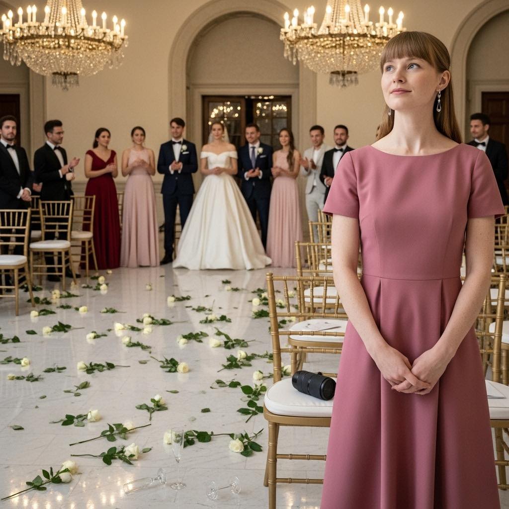 Copas de cristal yacían rotas en charcos brillantes sobre el suelo de mármol, manchadas con champán derramado. Rosas blancas estaban aplastadas bajo las huellas de los tacones, con los pétalos magullados y marrones en los bordes. Uno de los imponentes candelabros dorados se había volcado; sus velas aún humeaban mientras la cera se deslizaba por el metal como lágrimas derretidas. Las voces se alzaban y se rompían como olas: gritos furiosos, sollozos histéricos, el murmullo de gente cotilleando tras manos cuidadas.