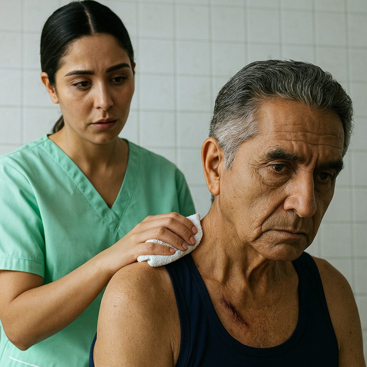 Él guardó silencio. Su respiración se volvió pesada, como si se estuviera preparando para aceptar algo inevitable. Preparé agua tibia, coloqué la silla especial en el patio y extendí las toallas. Lo ayudé a incorporarse y, mientras buscaba los botones de su camisa, escuché su voz temblorosa:
