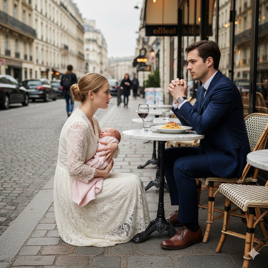 Se arrodilló junto a su mesa en la acera, acunando a su bebé. «Por favor, no quiero su dinero, solo un momento de su tiempo». El hombre del traje levantó la vista de su copa de vino, sin saber que sus palabras harían añicos todo lo que creía saber.