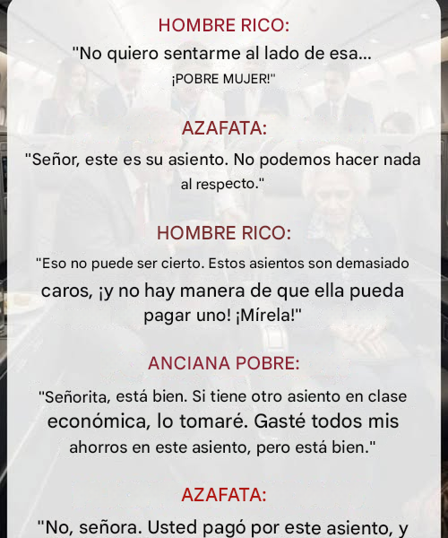 Pero la azafata negó con la cabeza. —No, señora. Usted pagó por este asiento y tiene todo el derecho a estar aquí, digan lo que digan los demás.