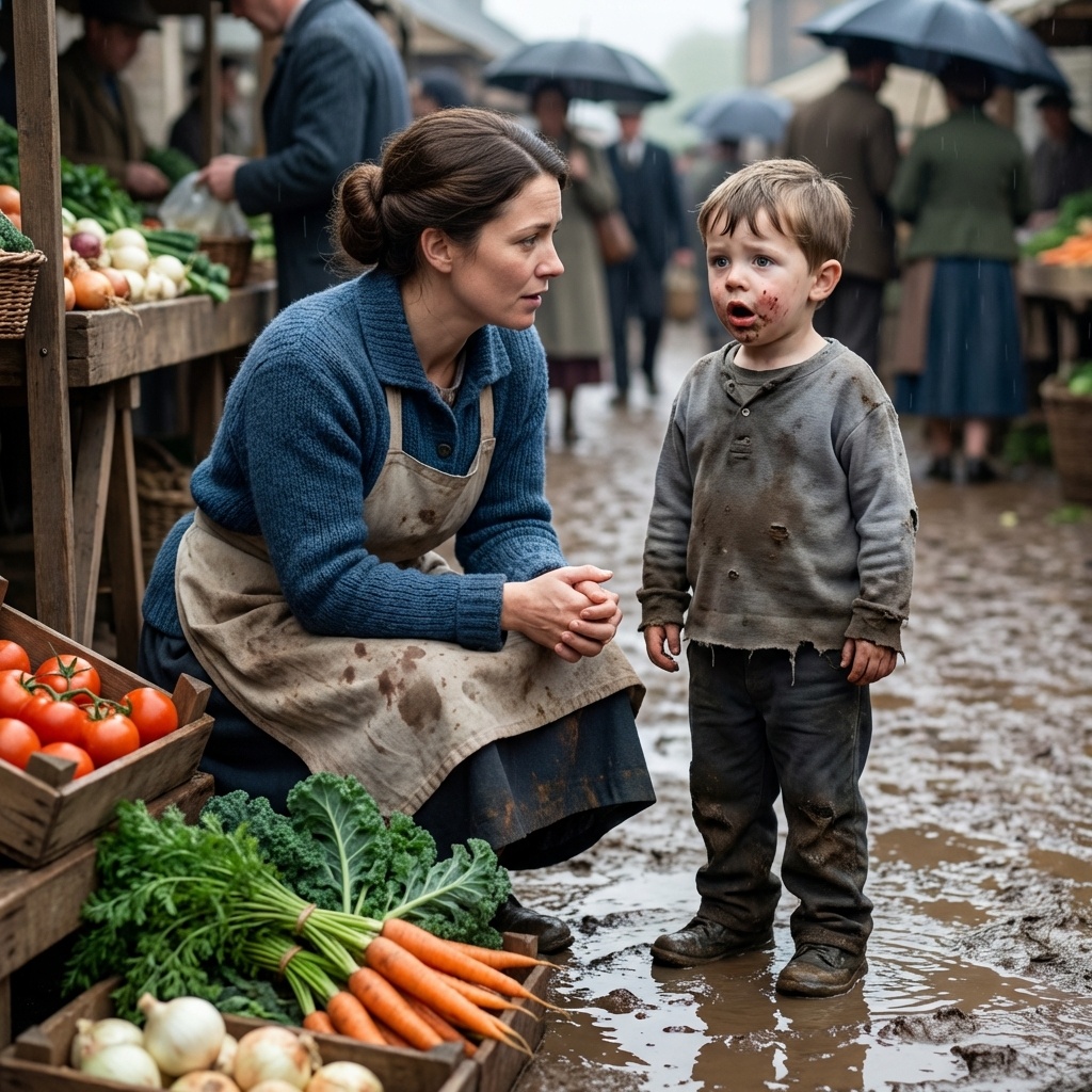 Entre ese bullicio caminaba un niño descalzo, con los pantalones empapados hasta las rodillas y el pelo pegado a la frente. Tenía cinco años, la mirada grande y seria, como si ya hubiera aprendido demasiado. Se llamaba Tomás, pero casi nadie lo decía en voz alta, porque en un pueblo las historias se cuentan rápido y los nombres de los que no tienen a nadie se olvidan con la misma rapidez. Nadie sabía de dónde había salido. Simplemente, una noche apareció bajo un toldo roto, tiritando, sin llorar, sin pedir. Desde entonces sobrevivía con lo que le caía en la mano: un mendrugo de pan, una manzana, alguna moneda por cargar una cesta.