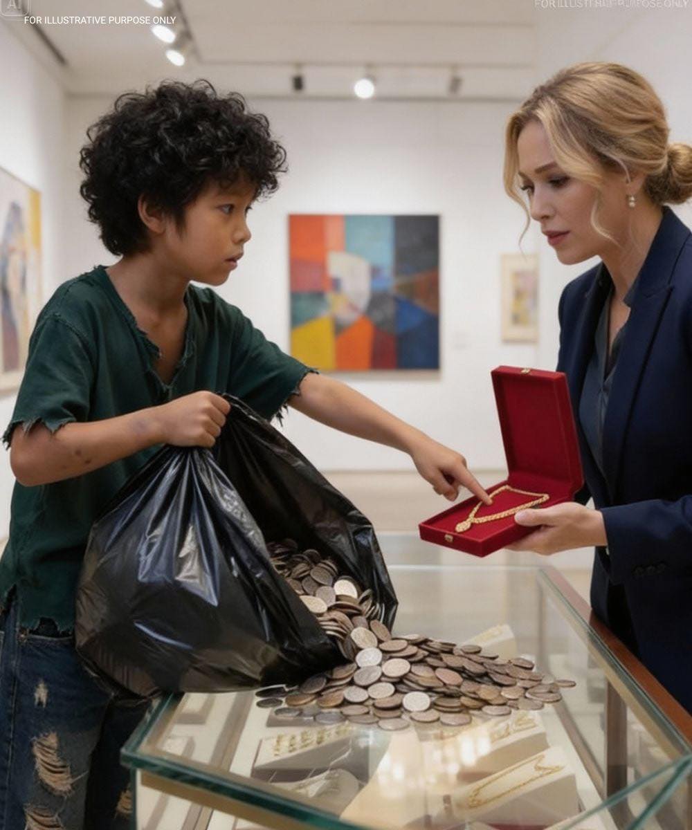 Un niño pequeño y harapiento vertía en silencio miles de monedas sobre el mostrador de cristal de una joyería de lujo.